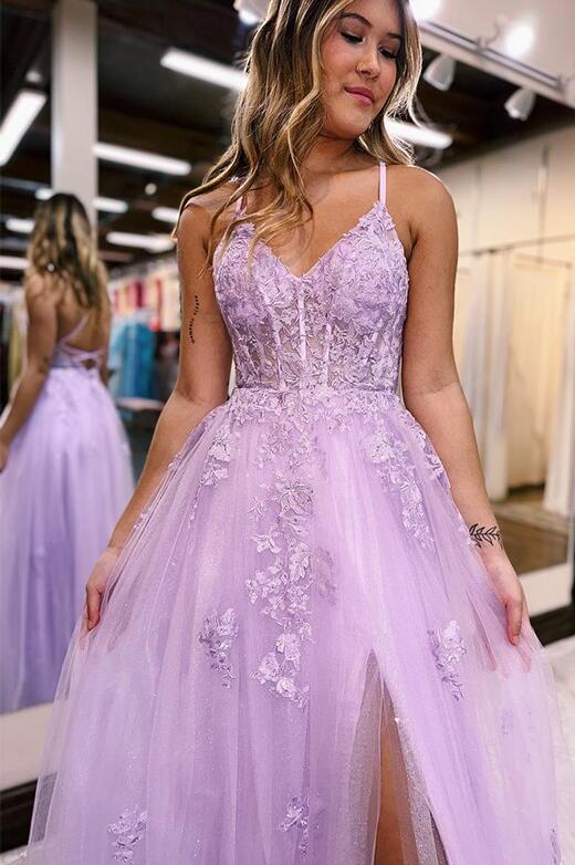Source : www.mychicdress.comLace 2024 Purple Prom Dresses Spaghetti Straps Long Party Dresses